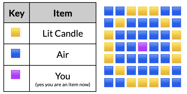 and the core spell material. The first method of casting spells requires 25 lit candles arranged in a 7x7 circle like so: